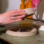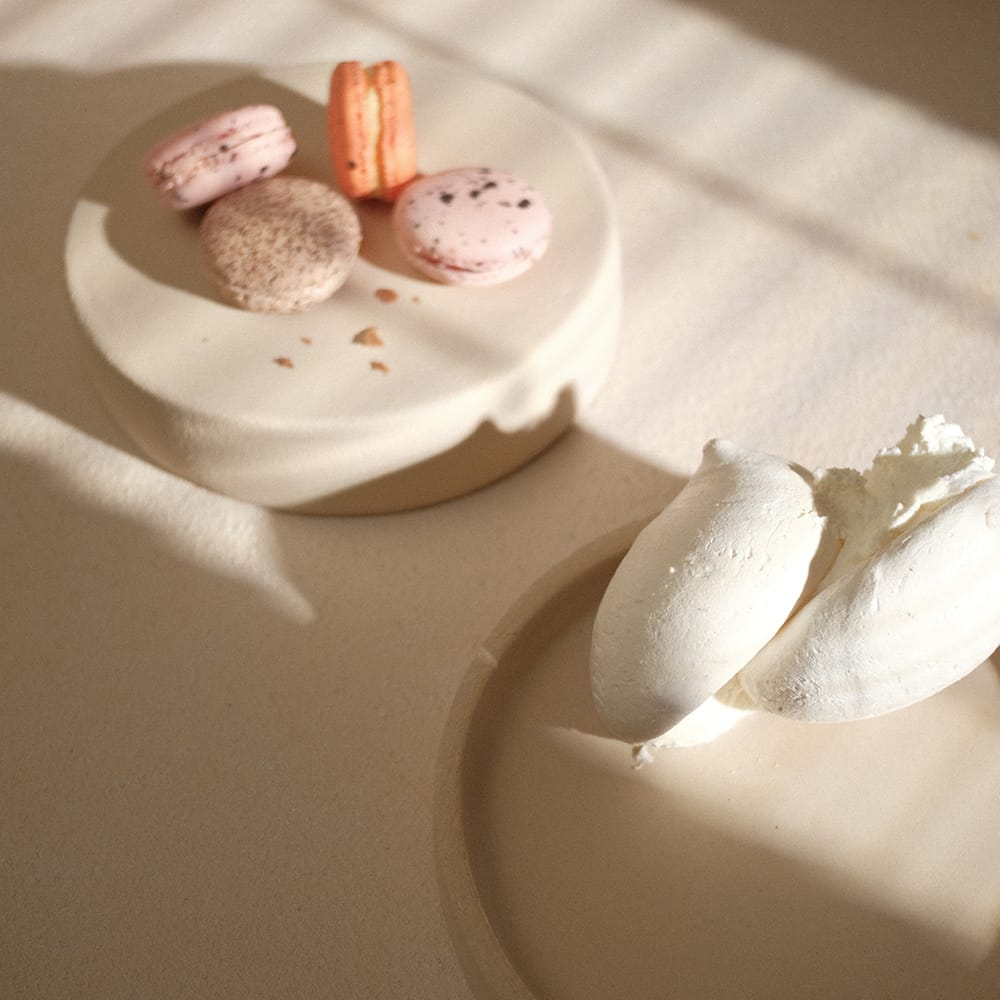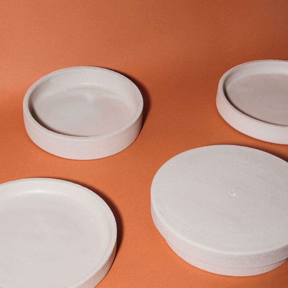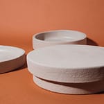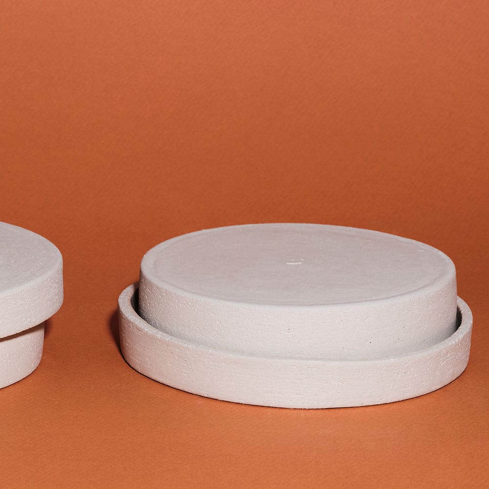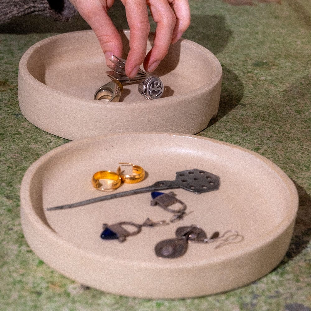 This object, as many in the shop, has several usages: it’s a treasure box, but if you open it, you can decide to use it either as a set of two plates or a set of two cake stands. Its organic and sculptural form, with a raw textured, looks like a stone on the outer surface, but it is glazed on the inside with a transparent/milky matt glaze.