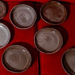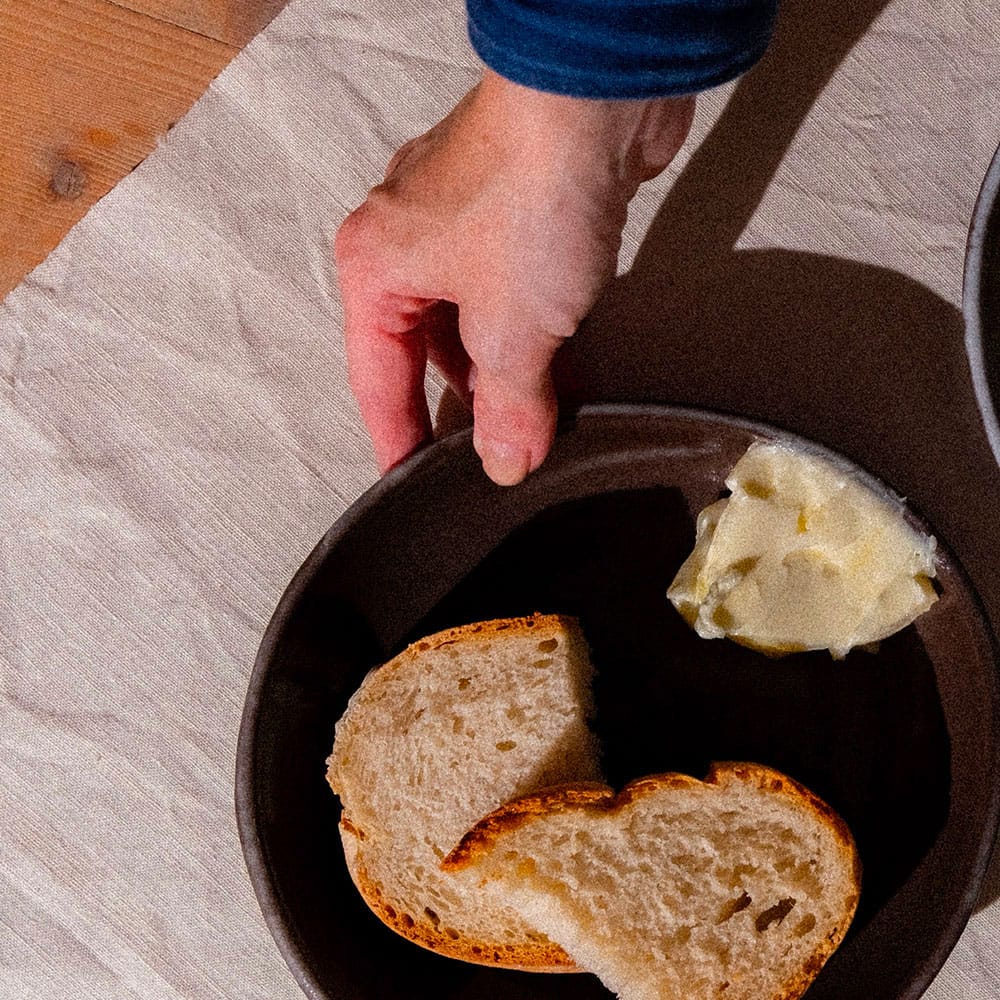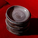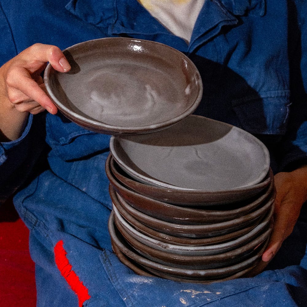 The Uni plates are designed for everyday use, versatile and universal, they work for any occasion. With a diameter of about 15 cm, they’re perfect as bread plates, for serving dessert, or for laying out individual portions of your favorite dishes on a well-set table. Made from black clay and dip-glazed, each piece is one of a kind, with shades ranging from matte white to deep glossy brown.